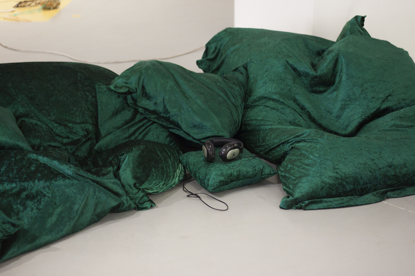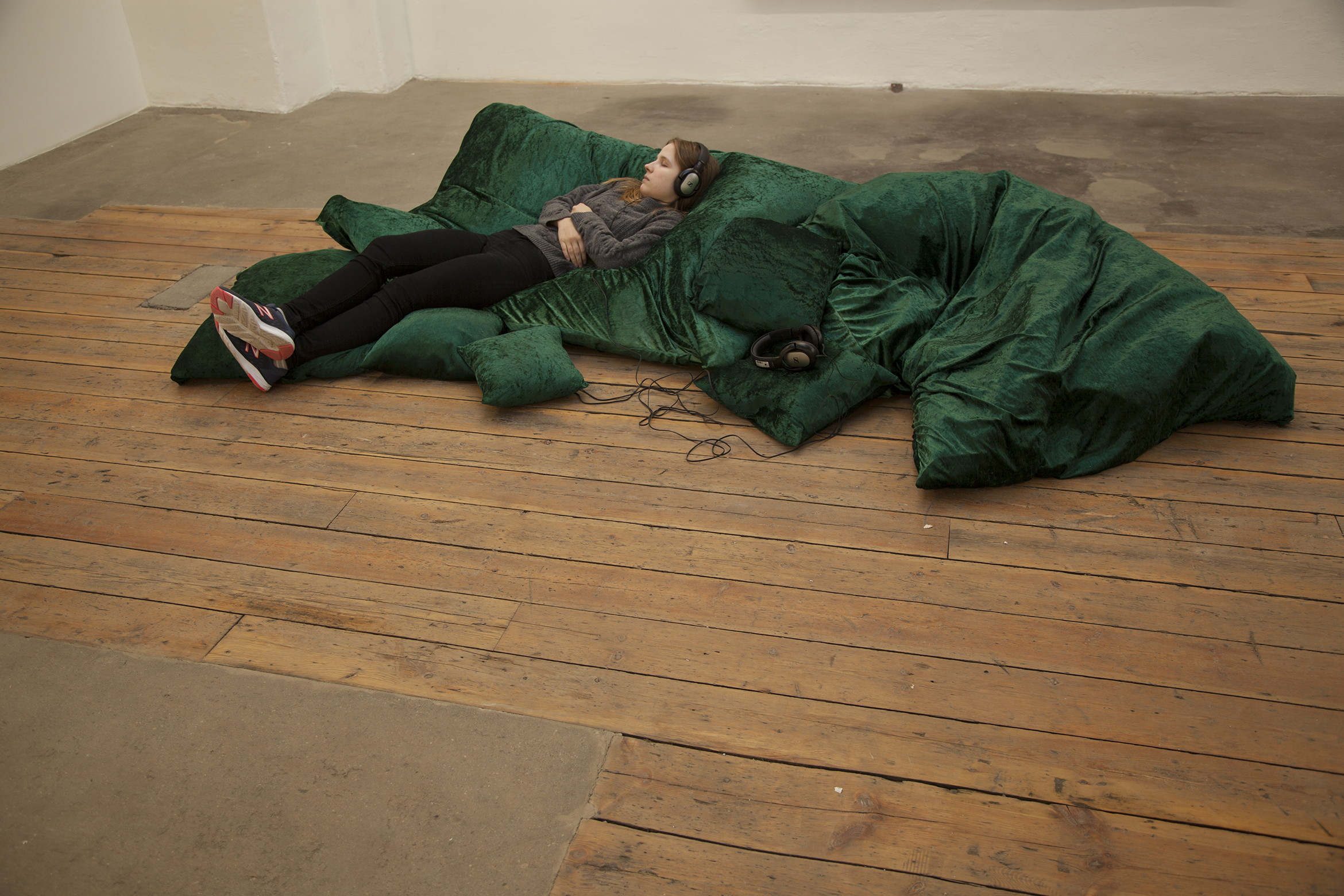 Ääni-installaatioääni 3 min, kuulokkeet, vihreällä sametilla päällystetyt säkkituolit2019